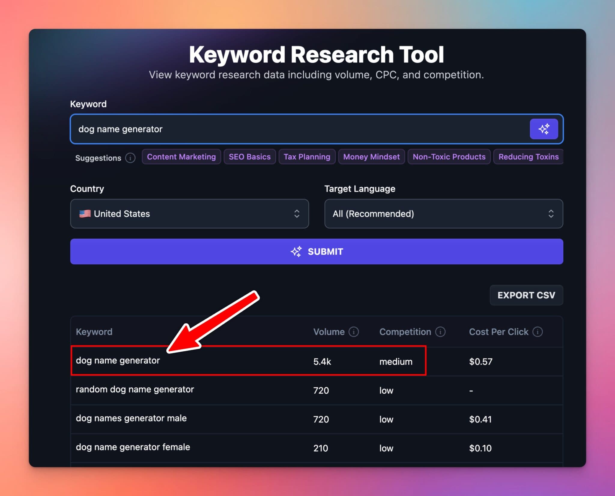 A fun example is a dog name idea generator. This tool generates dog name suggestions based on the dog’s breed and personality. Have a blog about pets? This might be the perfect lead magnet. It could potentially drive 5,400+ visitors to your website every month.