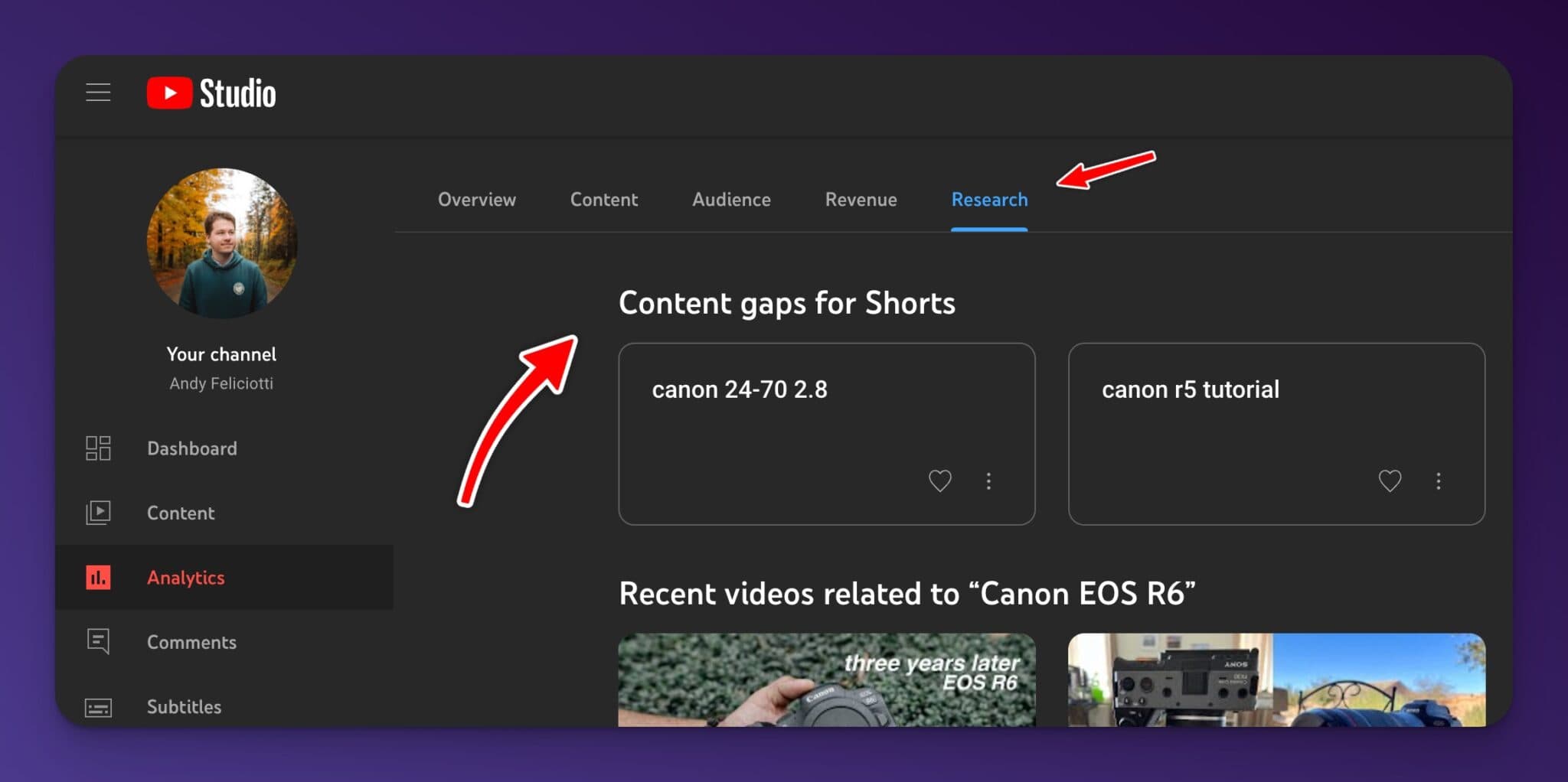 Use YouTube Studio to track your YouTube analytics and even see what content gaps exist for your channel using the “research” tab.