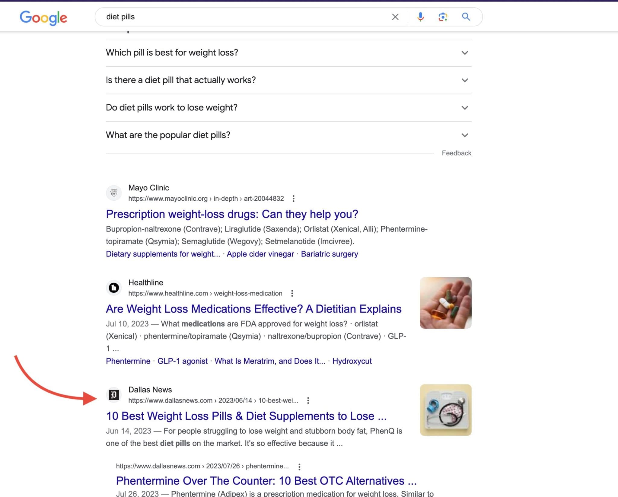 This has been a tactic used by local news sites for example. Here you can see “DallasNews.com” ranking for the competitive term “Diet Pills”. While Dallas News’ original content has nothing to do with health or dieting these articles leech of their domain’s high Domain Rating (DR).