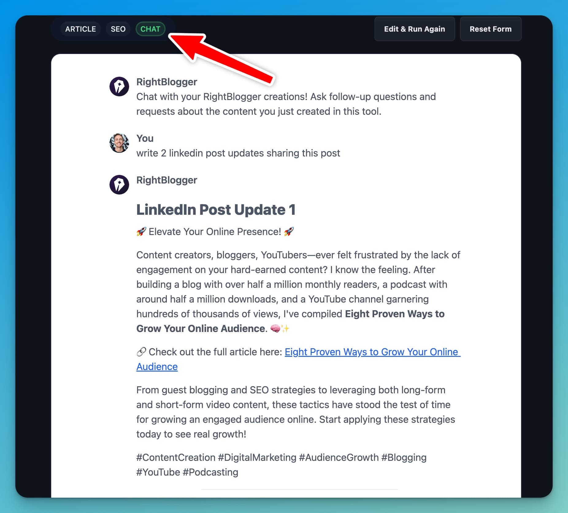You can also use chat inside many RightBlogger tools to refine what you just generated. For example, you can ask for a shorter version, a clearer intro, or a stronger conclusion without starting over.