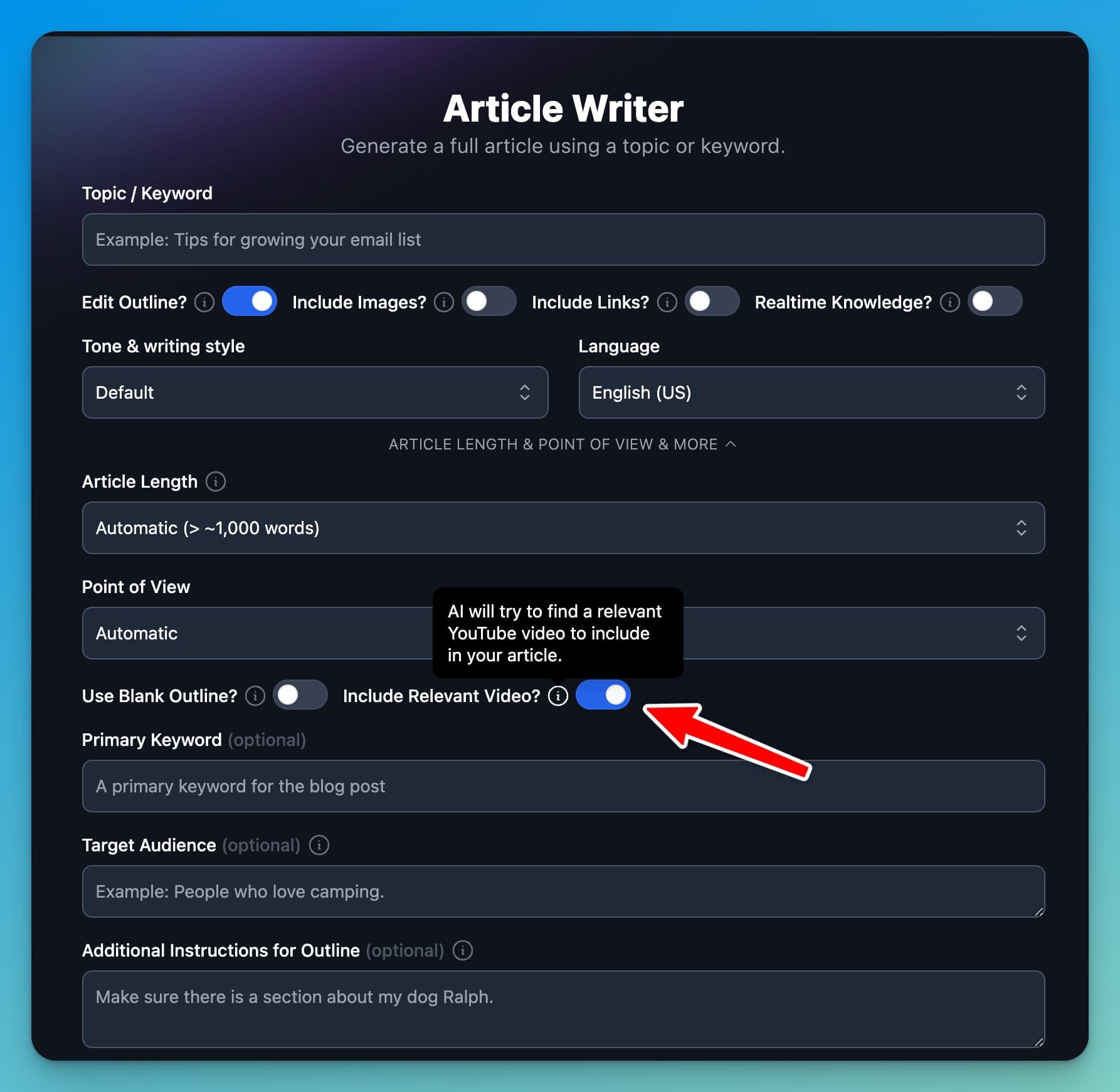 - YouTube Embeds: You can now include related YouTube videos directly into your content using tools like the Article Writer and YouTube Video to Blog Post Generator. By default when you toggle on the ‘Include Relevant Video’ button in the Article Writer, AI will source the YouTube video it believes is most relevant to your content topics. If you wanna work with your own videos, use our YouTube Video to Blog Post Generator, it’s my favorite.