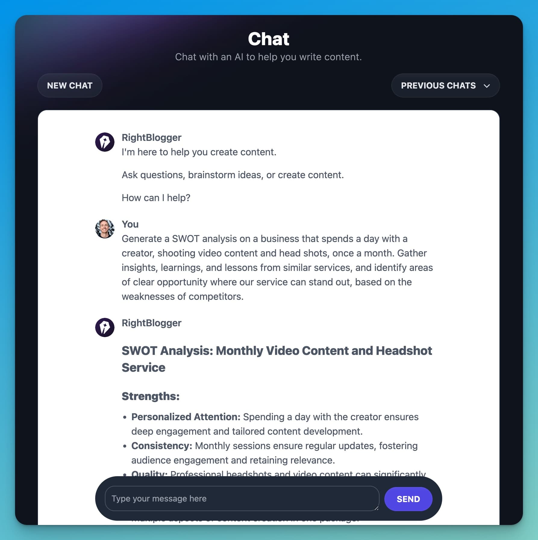 - Integrated Chat: You can also use the chat feature across almost all tools inside RightBlogger, allowing you to interact with your content, ask questions, tweak or improve your outputs, and get more mileage out of each creation.