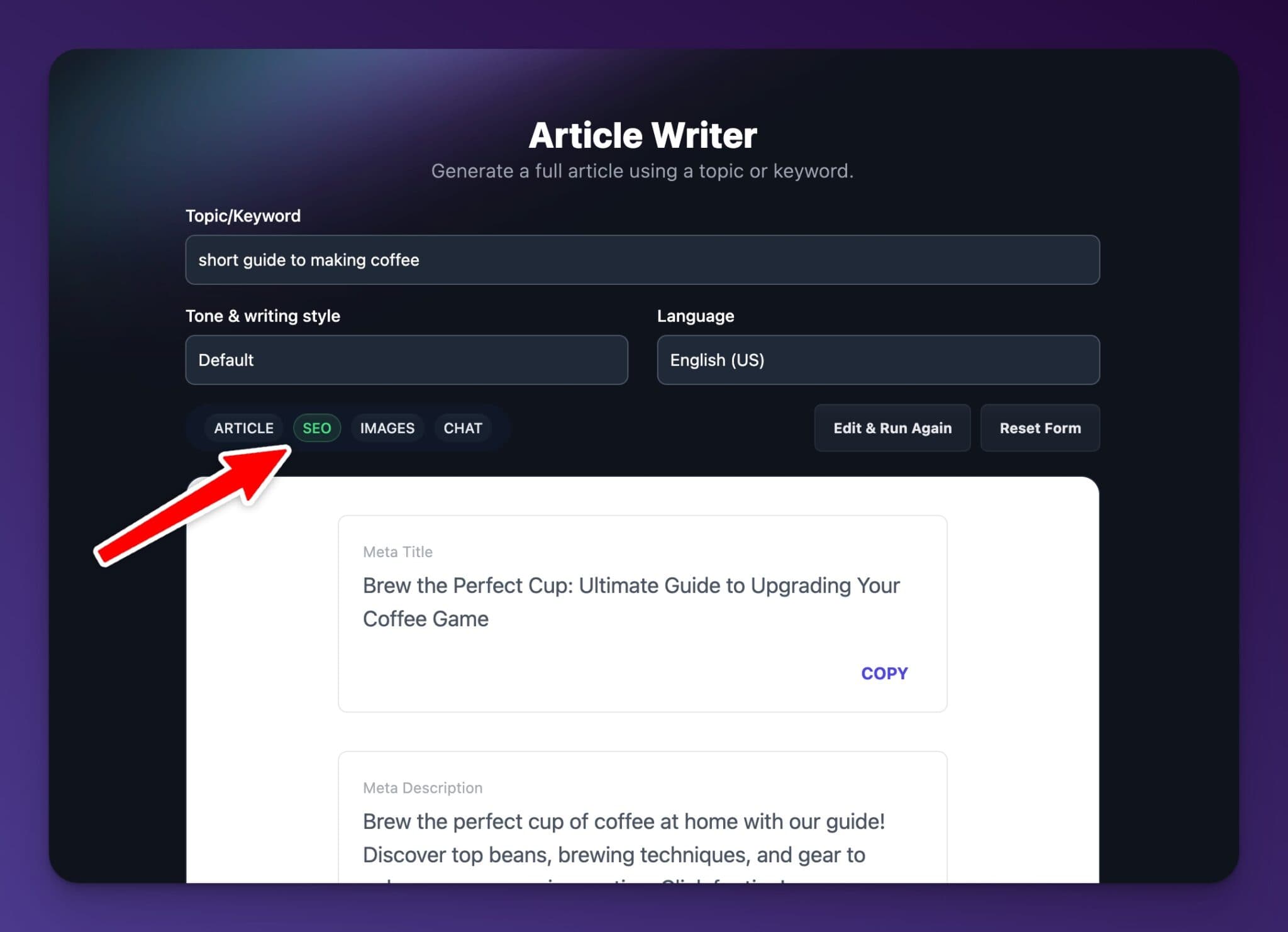 If you want to try it, start in the RightBlogger AI Article Writer and generate an article. Then check the SEO tab so you can copy the meta info into your site before publishing.